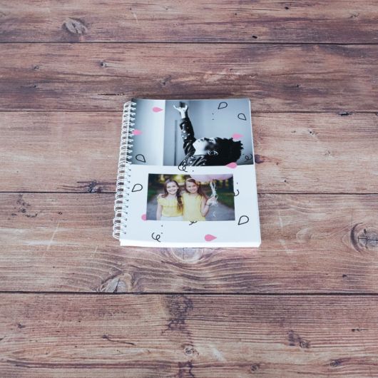 A capa e contracapa são totalmente personalizáveis e têm o formato A5.