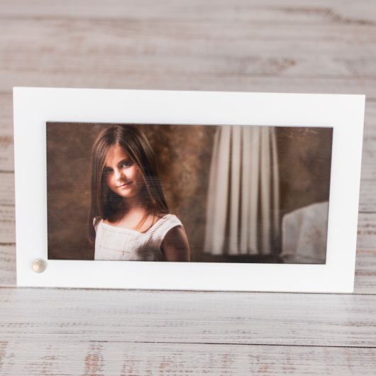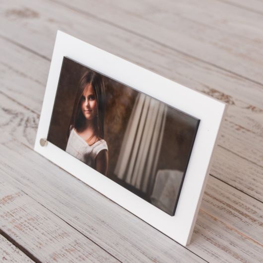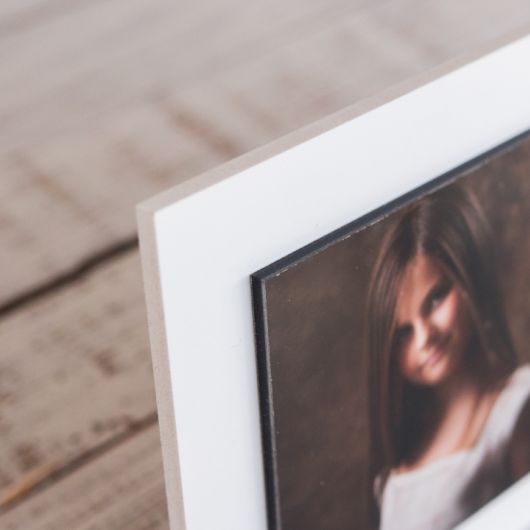 Esta opção permite conjugar a qualidade do papel fotográfico metálico colado em acrílico com uma moldura em PVC.