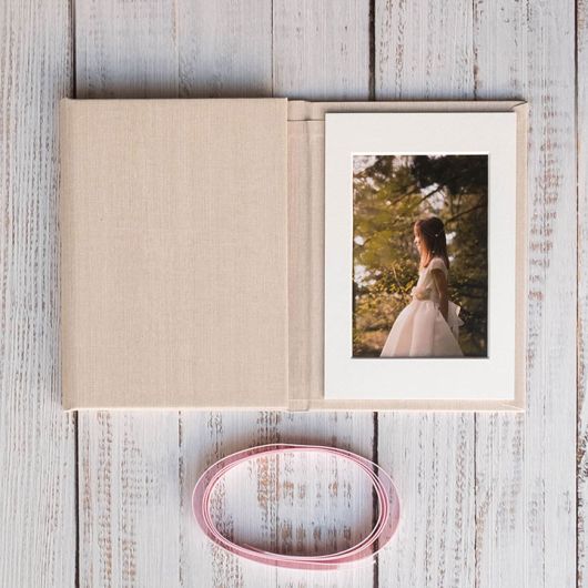 Esta é uma solução elegante, simples e irreverente de transformar as suas fotos em excelentes soluções para disponibilizar aos seus clientes com as fotografias de uma sessão de estúdio ou de um evento especial. O Trifólio suporta 3 fotografias com passepartout de cor branca. As capas são revestidas por um elegante tecido de Kasmir bege e estão envolvidas por uma elegante fita de gorgurão disponível em diferentes cores - um pormenor simples e encantador que fará toda a diferença na apresentação do produto.