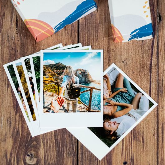 Fotografias com efeito vintage, graças ao formato do papel e rebordo branco. A sua elegante caixa, na qual estão inseridas, faz toda a diferença na apresentação do produto.
